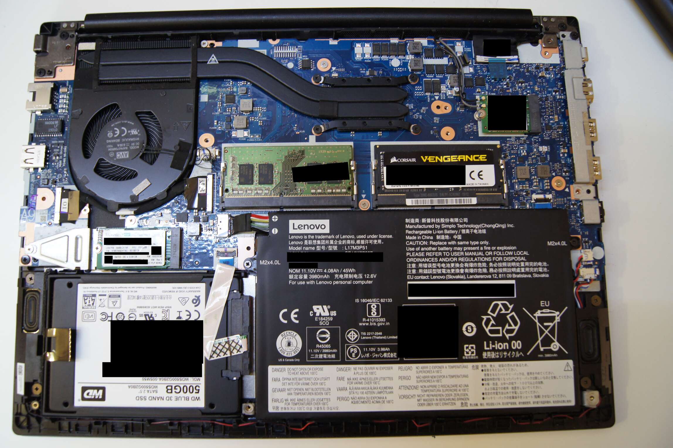 - A top-down look at the insides of the Thinkpad E495. You can see the layout of all the parts