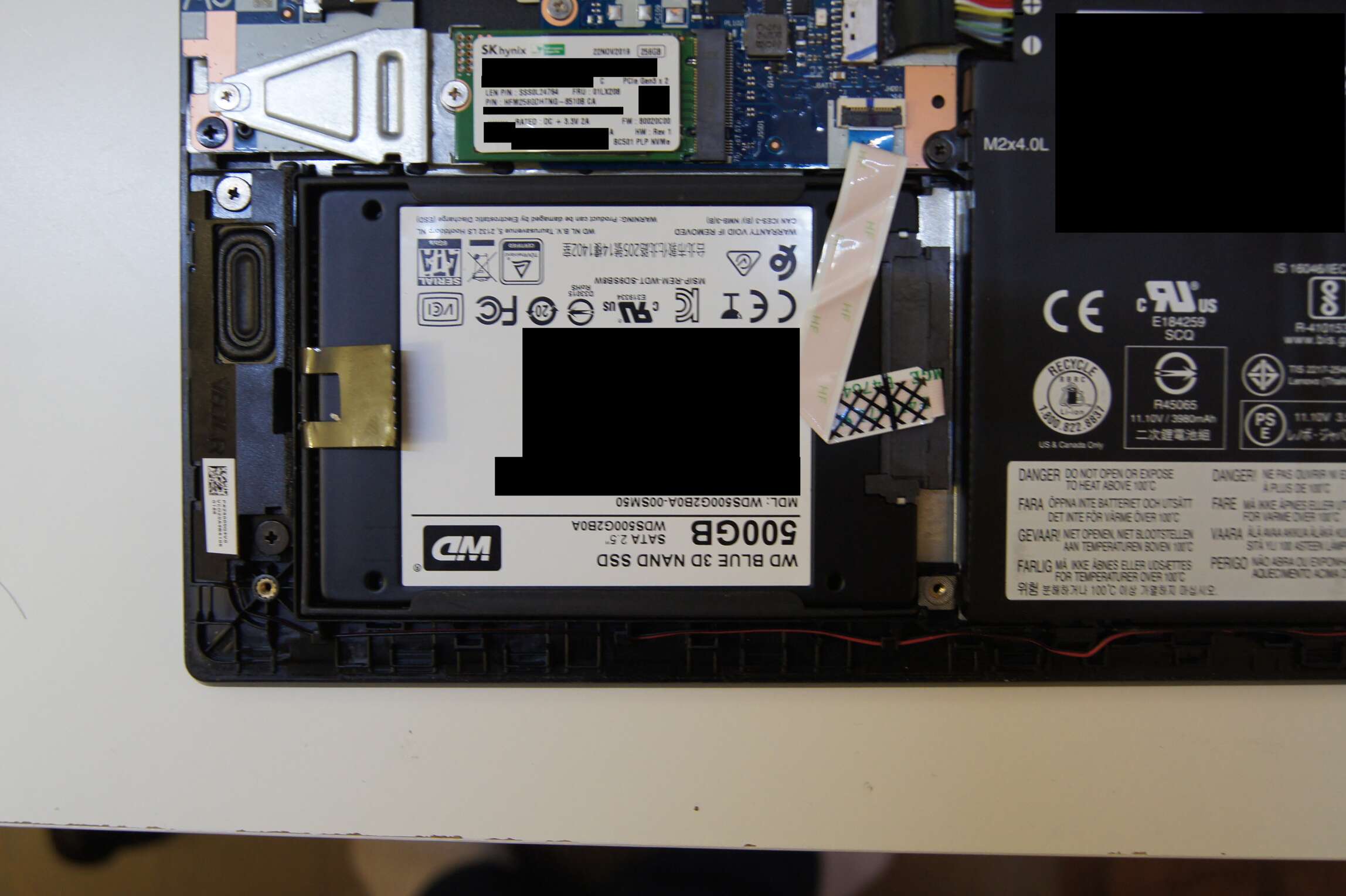 - The 2.5" HDD slot of the Thinkpad E495. Currently holding a 500GB WD Blue SSD.