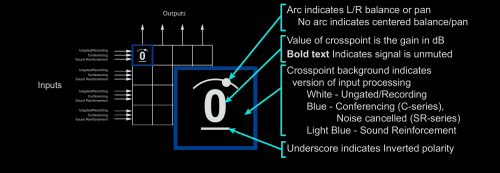 * On each input here, you can see the gain, mute, phantom power, then which tap-point from the signal chain to use. Then EQ and feedback suppression, then echo cancel, noise cancel, gain control, dynamics, automix, delay and fader.