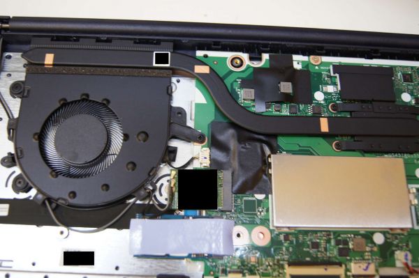 The CPU cooler consists of a large heatpipe to move heat away from the CPU to the heatsink. The heatsink is cooled by a typical fan for a laptop, a thin radial one.