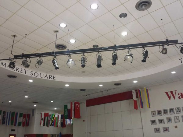 In the 2016-17 era, we got more CYC lights, so we put those up in the market square, later replaced in 17-18 to move those to the stage, bringing older tungsten scoop lights over. The halogen scoop lights here were moved to the drama room, other halogen ones to the stage. This was because market square benefits from those wider lights, especially given the positioning of the bar (a spot would just light top-down at these angles as seen above), and the halogen scoops with longer bulb life were on the stage as they are hard to replace, and classic incandescent on the stage, where we can easily replace them (if we find the right bulbs).